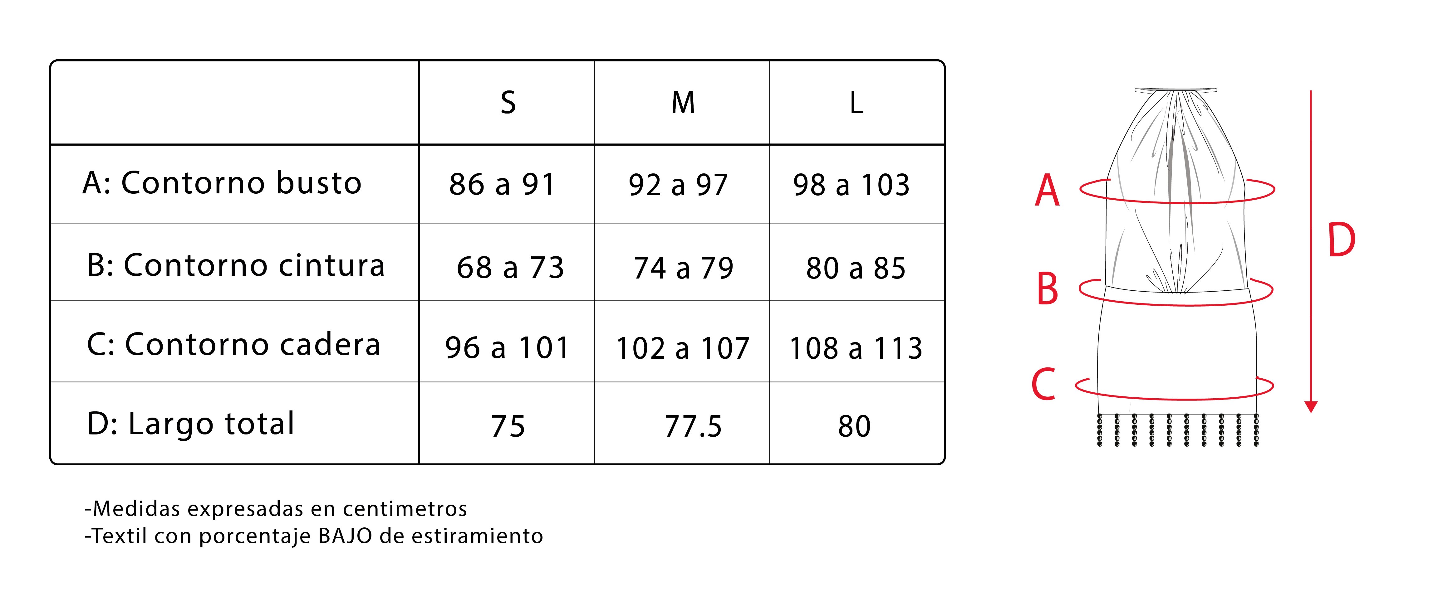 Vestido corto con escote halter anudable detrás del cuello. Tanto su top como su falda generan frunces decorativos. Lleva flecos en la zona del ruedo. Está completamente forrado.